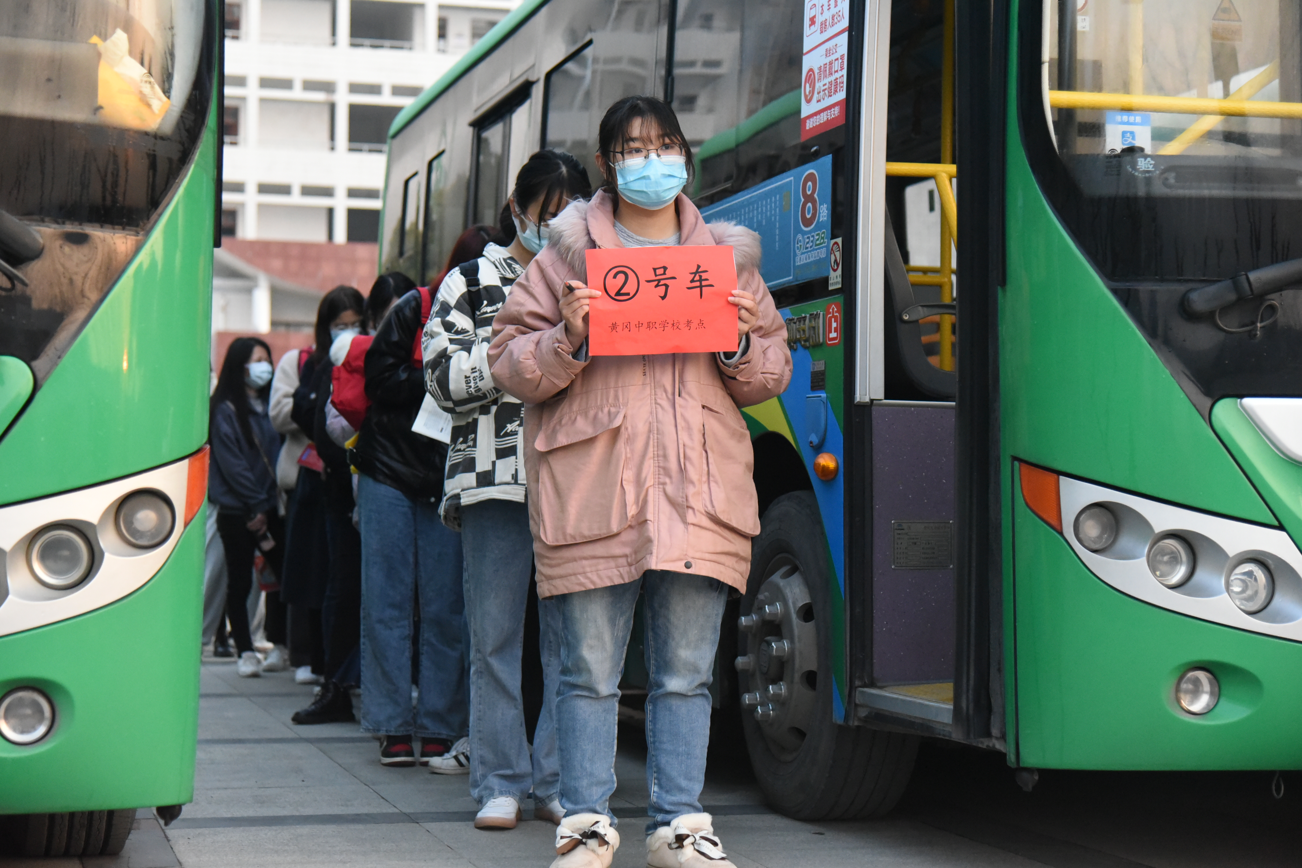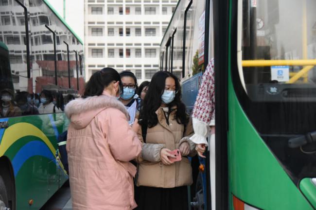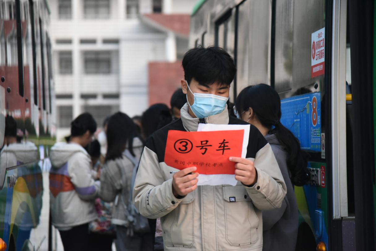 早上7:00,考生依次有序上车,学生干部对车辆座位进行协调并在发车前反复清点人数,考生上车后也不忘放下书本,继续复习。