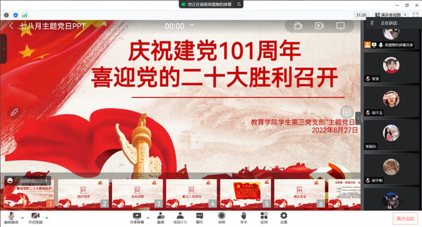 为贯彻落实党中央有关精神,2022年8月27日下午18:00,海燕策略研究网址查询学生第三党支部在腾讯会议开展七、八月份主题党日,此次会议以“庆祝建党101周年,喜迎党的二十大胜利召开”为主题,学生第三党支部书记邹焱萍、支委宋国柱出席本次会议,全体学生党员参加本次会议,会议由学生党员高慧敏主持。