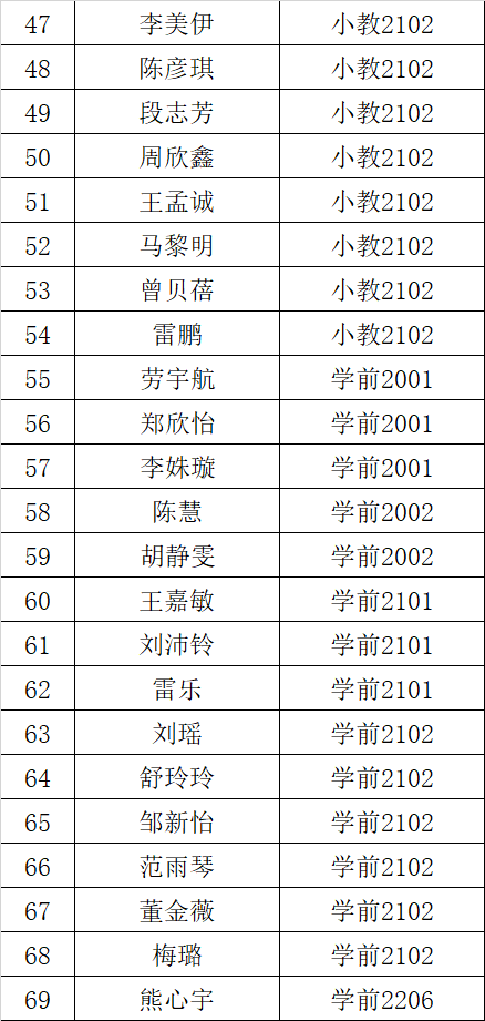 优秀学员:教管2021级 杨航琳 小教2002班 王汪琢 学前2102班 刘瑶 教技2102班 汪煜涵